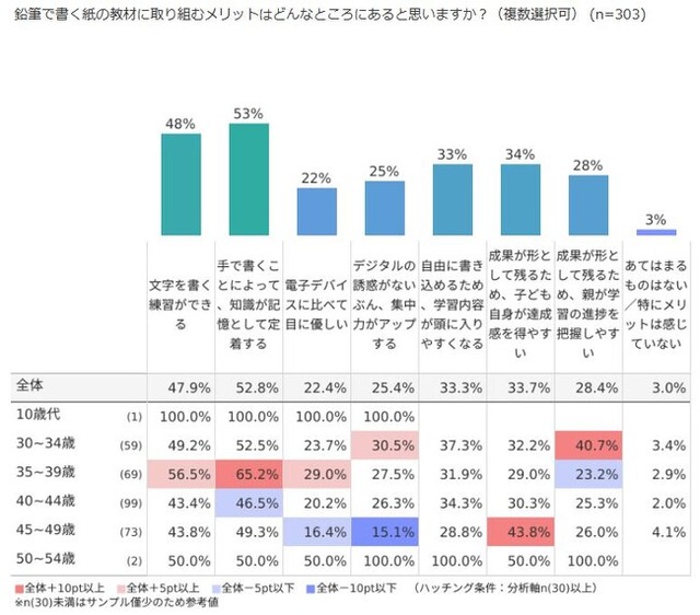 1位の「手で書くことによって、知識が記憶として定着する」については特に35~39歳が(65.2%)、3位にランクインした「成果が形として残るため、子ども自身が達成感を得やすい」については45~49歳が(43.8%)、5位にランクインした「成果が形として残るため、親が学習の進捗を把握しやすい」については30~34歳が(40.7%)、それぞれメリットと感じていることがわかります。