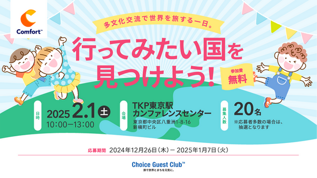 全国に「コンフォートホテル」「コンフォートホテルERA」「コンフォートイン」「コンフォートスイーツ」「Ascend Hotel Collection(TM)」を展開する株式会社チョイスホテルズジャパン(本社:東京都中央区、代表取締役社長:伊藤孝彦、以下チョイスホテルズジャパン)は、2025年2月1日(土)小学生を対象とした多文化交流イベント「多文化交流で、世界を旅する一日。行ってみたい国を見つけよう!」を初めて開催します。