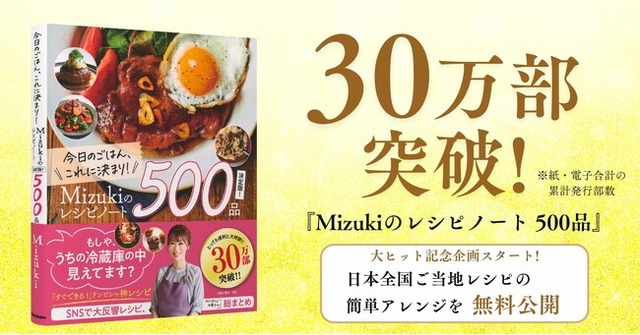 株式会社 学研ホールディングス(東京・品川/代表取締役社長:宮原博昭)のグループ会社、株式会社 Gakken(東京・品川/代表取締役社長:南條達也)が発行する『Mizukiのレシピノート決定版!500品』が、2024年12月に累計発行部数30万部を突破しました(紙・電子合計)。大ヒットを記念して、2024年12月19日(木)より日本全国のご当地食材を使ったMizuki考案の簡単アレンジレシピ10点を学研公式ブログにて無料公開いたします。