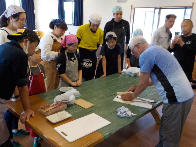 京都府で水揚げされた魚介類を使った魚さばき・調理・試食(刺し身、煮付け、アカモク味噌汁)