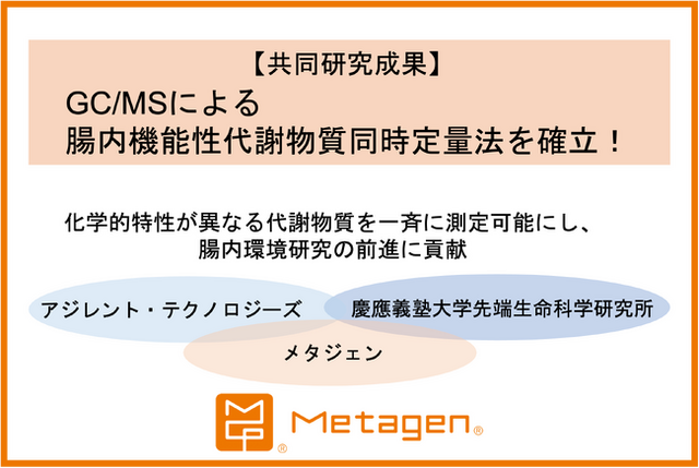 株式会社メタジェン(本社:山形県鶴岡市、代表取締役社長CEO:福田真嗣、以下、「当社」)は、腸内環境研究をより加速させるべく、腸内細菌叢の機能評価に向けたGC/MS(ガスクロマトグラフ質量分析計)による腸内機能性代謝物質同時定量法をアジレント・テクノロジー株式会社、慶應義塾大学先端生命科学研究所と共同開発いたしました。その研究成果が科学雑誌「Gut Microbes Reports」に2024年12月9日付で掲載されました。