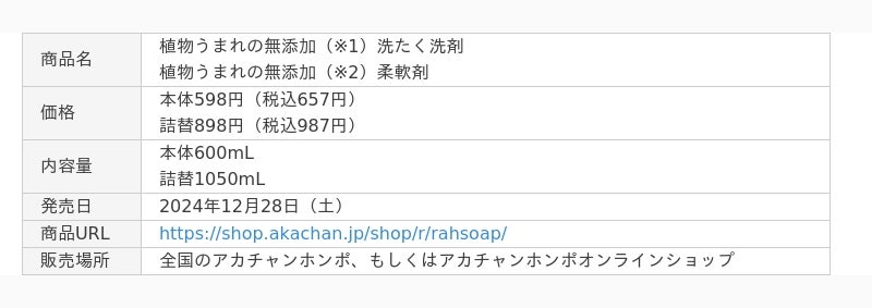サラヤ株式会社(本社:大阪/代表取締役社長:更家悠介)は、株式会社赤ちゃん本舗との共同開発商品「植物うまれの無添加(※1)洗たく洗剤」と「植物うまれの無添加(※2)柔軟剤」を、2024年12月28日(土)より、新発売することをお知らせいたします