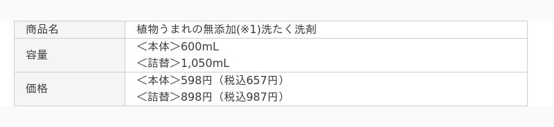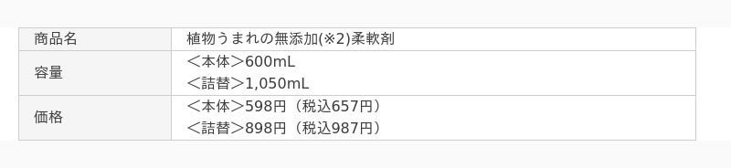 今回発売する「植物うまれの無添加(※1)洗たく洗剤」は無添加(※1)+機能性(洗浄力と使いやすいさ)を兼ね備えた、家族みんなで使えるランドリーシリーズです。石油系合成界面活性剤や蛍光増白剤・漂白剤・香料・着色料・抗菌剤は不使用ながら、基本性能である洗浄力を高めることで少量でしっかりと汚れを落とします。また、「植物うまれの無添加(※2) 柔軟剤」は汗っかきな赤ちゃんのために高い吸水性を保ちながら、摩擦を減らしてふんわりやさしく仕上がる無香料タイプ。赤ちゃんを抱っこするママ・パパの衣類もやさしく仕上げます。