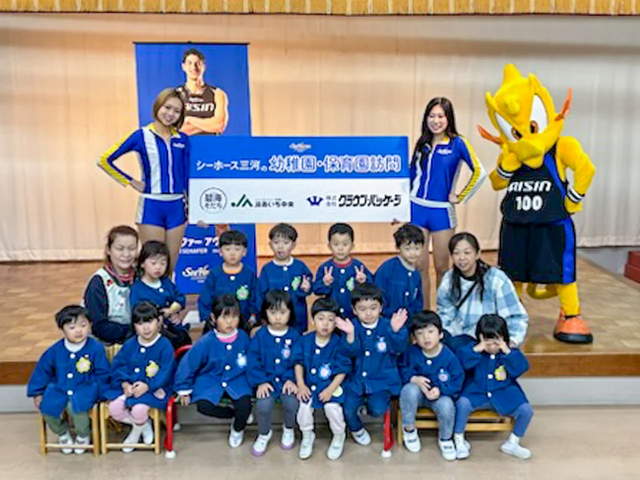 2024年11月26日(火)、シーホースくんとSuper GirlsのKAHO、RIKOが八十塚保育園(岡崎市)を訪問し、園児の皆さんと一緒にクイズやダンスを楽しみました。