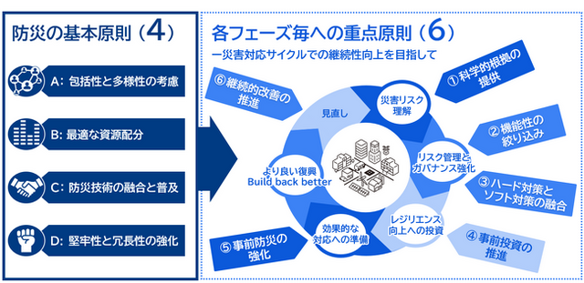防災を考慮したコミュニティ・インフラストラクチャーの計画、建設、活用、維持、改善のための原則と基本要件をまとめています。この原則は、仙台枠組の考え方を踏まえ、4つの基本原則(A包括性と多様性の考慮、B最適な資源配分、C防災技術の融合と普及、D堅牢性と冗長性の強化)と災害対応フェーズに沿った6つの重点原則(1.科学的根拠の提供、2.機能性の絞り込み、3.ハード対策とソフト対策の融合、4.事前投資の推進、5.事前防災の強化、6.継続的改善の推進)から構成されます(下図)。