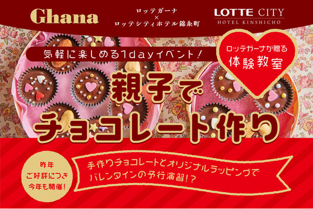ロッテシティホテル錦⽷町(所在地:東京都墨田区錦⽷4-6-1、総支配人:福井朋也)は、2024年2月に初めて実施しご好評をいただいた、ロッテ「ガーナ」とコラボレーションした「親子でチョコレート作り体験教室」をバレンタイン時期に合わせて[2025年2月11日(火)14:00-16:00]に開催いたします。