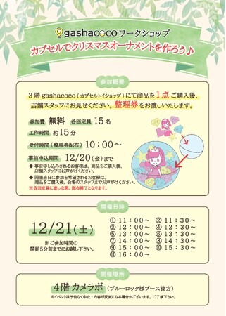 【イベント名】 gashacocoワークショップ ~空カプセルで工作しよう~カプセルでクリスマスオーナメントを作ろう♪