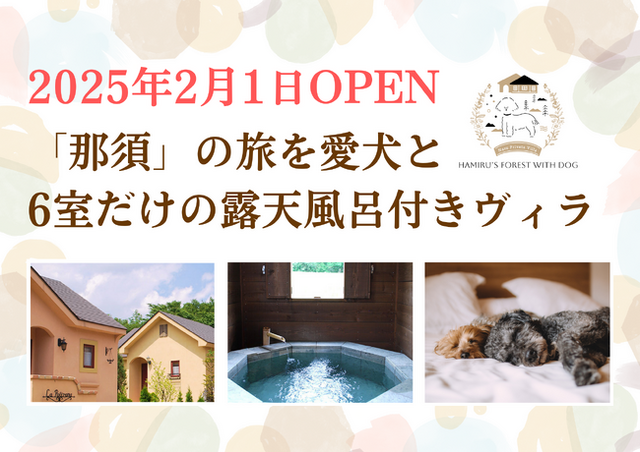 株式会社HAMIRU(所在地:千葉県市川市 代表:熊崎紗弥佳 以下「HAMIRU」)は、栃木県那須町の自然豊かな環境に愛犬と一緒に楽しむことができる全6室の客室露天風呂付きヴィラ「HAMIRU’S FOREST with DOG」(ハミルズフォレスト ウィズ ドッグ)を2025年2月1日にグランドオープンいたします。https://www.hamirus-forest.com/
