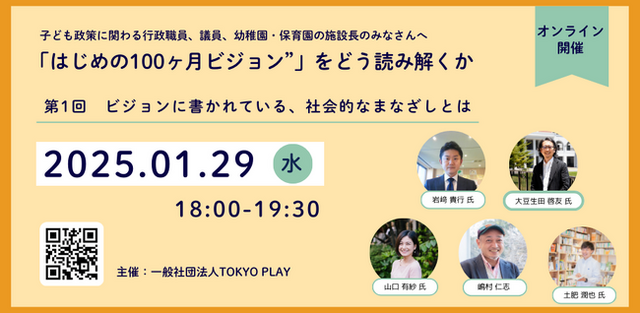 第1回では、保育、遊び、ウェルビーイングの視点から「乳幼児期までのこどもの育ちに係る基本的なビジョン」(はじめの100ヶ月の育ちビジョン)を読み解き、子どもの遊びに対する社会的なまなざしのあり方を考えます。
