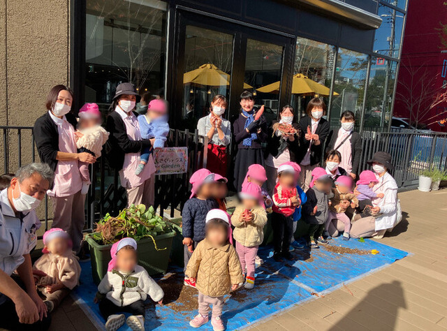 さくら保育園のみなさんの初めての「おいもほり」体験は、プランターを前にどうしていいのかわからない様子でした。それでも、先生が引っ張り上げた苗の根にサツマイモ が見えると、興味深々でサツマイモを触ったり、苗を引いたりと思い思いのおいもほりが始まりまし た。最後には、土の中に残った小さなサツマイモまで、残すことなくどんどん掘り出し収獲が終わりました。 みんなで力を合わせて収獲したサツマイモは、しばらく熟成のため休眠します。 あま~くなった頃にみんなで「いただきます!」と秋の実りを味わいます。