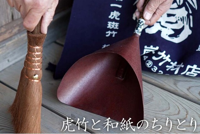 「一閑張り虎竹塵取り」は、虎竹の柄に和紙を巻き、柿渋を塗り重ねて仕上げた日本伝統の技術で作られています。手に触れると感じる和紙の心地よい風合い、そして柿渋の塗り重ねによる深みのある色合いが、掃除道具でありながら部屋に置いておくだけでも上品なインテリアアイテムとして活躍します。