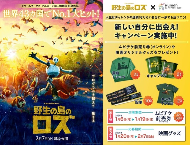 全国に2,000教室以上、27,000名以上の生徒数を誇る国内最大規模(※)のロボット教室を展開するヒューマンアカデミージュニアでは、『シュレック』『ボス・べイビー』をはじめ数々の傑作アニメーションで世界中に笑いと涙を届けてきたドリームワークス・アニメーション30周年記念に贈る、感動と奇跡のアドベンチャー『野生の島のロズ』の公開に際し、タイアップキャンペーンを実施することといたしました。