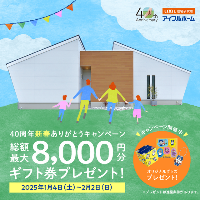 株式会社LIXIL住宅研究所アイフルホームカンパニーは、2025年1月4日(土)から「40周年新春ありがとうキャンペーン」を開催します。期間中、アイフルホームで開催している各種イベントに事前予約の上、ご来場いただいたお客様に見学予約特典として、最大総額8,000円(ギフト券)+お子様向け来場プレゼントとして、オリジナルキャラクター「きっずなー」グッズをプレゼントするキャンペーンです。