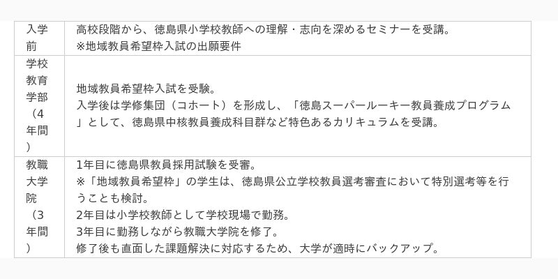 徳島県版の「地域教員希望枠」では、県内の様々な課題への対応力を持ち、学校の小規模化の中でも学校間連携を推進し学校力を強化できる若手リーダー教師を、学部4年間と教職大学院3年間(うち2年目は教員として学校現場で勤務、3年目に勤務しながら教職大学院を修了)の7年間で計画的に養成する点に大きな特色があります。