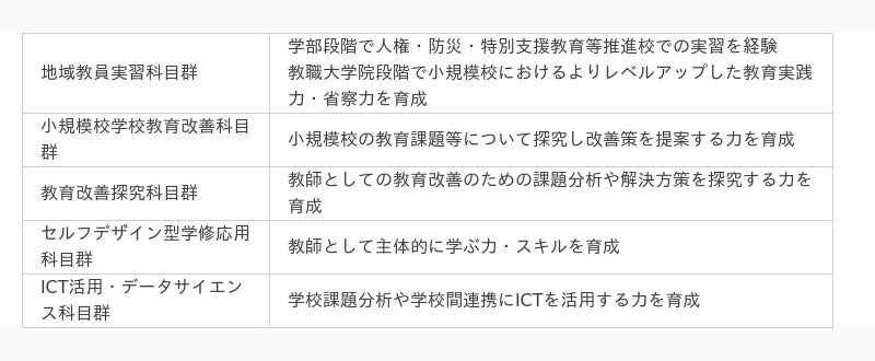 これらの力量を確実に修得させるために、学部・教職大学院を通して特設科目「徳島県中核教員養成科 目群」を設定するとともに、地域教員希望枠学生(5名)のコホートによる協働学修をベースに学部・教職大学院接続インターバル型履修によるカリキュラムを展開します。