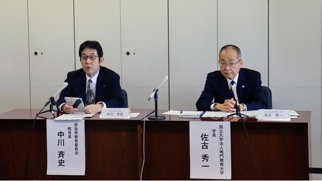 徳島県教育委員会 中川教育長(左)と鳴門教育大学 佐古学長(右)の合同記者発表