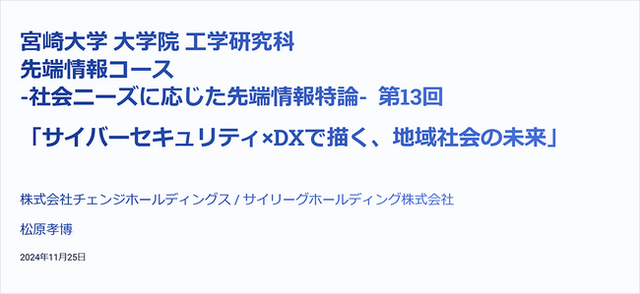 宮崎大学、宮崎県警察本部(以下、宮崎県警)、宮崎県サイバーセキュリティ協議会(以下、MiCS)、株式会社チェンジホールディングスの子会社で、サイバーセキュリティ事業を推進する中間持株会社であるサイリーグホールディングス株式会社(以下、サイリーグHD)は、宮崎大学大学院工学研究科にて今年度開設された先端情報コースの”社会ニーズに応じた先端情報特論”の講義において、サイバーセキュリティ・DX人材育成を目的に、産学官民連携による共同講義を実施したことをお知らせいたします。