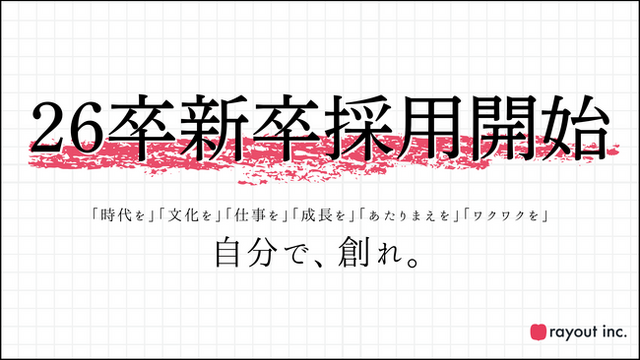 コミュニケーションデザインと制作DXを提供するrayout株式会社(所在地:東京都渋谷区、代表取締役:吉田壮汰、以下rayout)は2024年12月、2026年度入社 新卒採用本選考のエントリーを開始したことをお知らせいたします。rayoutはこれまで通年採用を行っていたため、初の新卒採用となります。