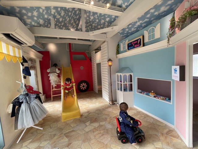 消防車の梯子を登り、滑り台から出動。無料貸出衣装に着替え警察署や病院で職業体験も楽しめる。