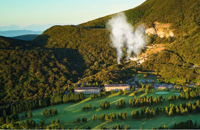 - 山肌から湧き上がる温泉蒸気を背景に浴衣姿でスマッシュ!