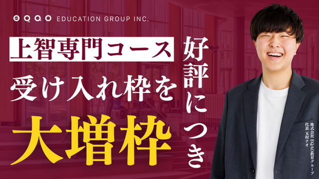 上智大学の全学部・全学科で実施されている公募推薦入試は、まさに「受けなきゃ損!」の入試制度の一つです。そのような中、講師の8割が現役上智大生で業界トップクラスの合格率54.4%を誇る総合型選抜専門塾EQAOが、上智大学専門コースに特化した指導を行っています。