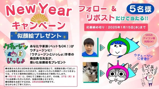 Kindle、楽天koboをはじめとする各電子書籍ストアで【連載版】4巻まで配信中の大人気コミックエッセイ『ウチュージンといっしょ』。このたび、新刊配信記念&年末年始企画として、似顔絵プレゼントキャンペーンを実施します。