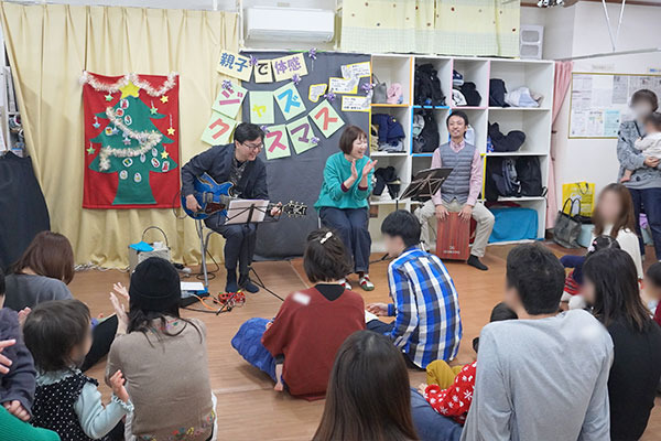 後半は、安達のギター、弊社運営の音楽教室 ドラム学科「ドラム義塾」創立者の西のパーカッション演奏に合わせて、ヴォーカル学科「ヴォーカル技塾」インストラクターの小西麻美が、クリスマスソングや童謡をジャズアレンジで披露し、間近に迫ったクリスマスを親子で楽しみました。