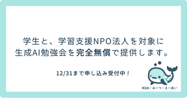 これは、教育支援に携わるNPO法人の皆さまに、経済的な負担をかけることなく、最新の生成AI技術を習得していただくためです。