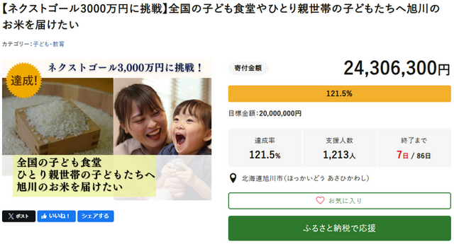 当事業では、「全国の子ども食堂やひとり親世帯の子どもたちへ旭川のお米を届けたい」というプロジェクト名で、企業や個人の方から、ふるさと納税を活用する形で寄附を募集しています。