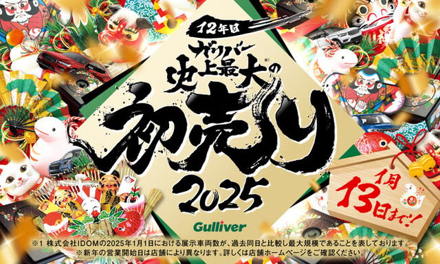 2025年1月1日(水・祝)よりスタートする「ガリバー史上最大の初売り」は、ガリバーの初売りで過去最多(※1)となる約3万5000台のおクルマをご用意しております。人気車種や厳選したおすすめ車両など、多種多様な展示車両の中から、ガリバーならではのおクルマ選びをお楽しみいただけます。