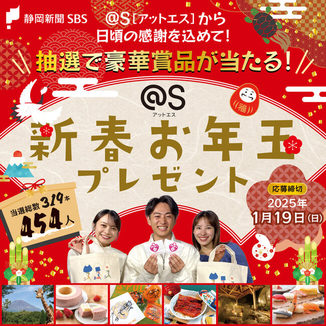 静岡新聞SBSは2024年12月23日、情報サイト「@S(アットエス)」に「新春お年玉プレゼント」キャンペーンの特設ページを開設しました。応募締切は2025年1月19日です。