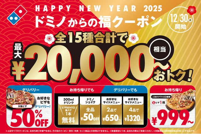 株式会社ドミノ・ピザ ジャパン(代表取締役:ジョシュア・キリムニック、CEO:マーティン・スティーンクス、本社:東京都品川区、以下:ドミノ・ピザ)が展開する国内No.1シェアを誇る宅配ピザチェーン ドミノ・ピザは、2024年12月30日(月)~2025年1月19日(日)まで期間、合計2万円相当おトクになる「ドミノからの福クーポン」をご提供します。人と集まる機会の多い年末年始は、デリバリーやお持ち帰りで、おトクなピザパを何度でもお楽しみください!