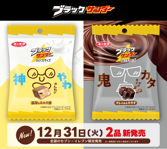 有楽製菓株式会社(本社:東京都小平市、代表取締役社長 河合辰信)は、ブラックサンダーシリーズから「ブラックサンダーひとくちサイズ 神やわ」「ブラックサンダーひとくちサイズ 鬼カタ」を、2024年12月31日(火)より順次、全国のセブン-イレブンにて発売いたします。※一部店舗では取り扱いのない場合がございます。