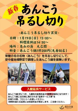 令和7年の新春、恵みの湯にて常磐の冬の名物、”あんこう”の吊るし切り実演を開催いたします。