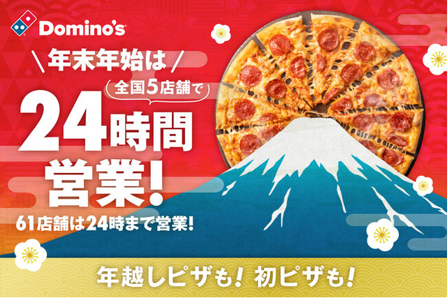 株式会社ドミノ・ピザ ジャパン(代表取締役:ジョシュア・キリムニック、CEO:マーティン・スティーンクス、本社:東京都品川区、以下:ドミノ・ピザ)が展開する国内No.1シェアを誇る宅配ピザチェーン ドミノ・ピザは、2024年の大晦日(12月31日)~元旦(2025年1月1日)にかけて、「大久保店(東京都)」「東心斎橋店(大阪府)」「札幌南7条西店(北海道)」「長崎宝町店(長崎県)」「宜野湾大謝名店(沖縄県)」の5店舗で24時間営業を行ないます。全国61店舗は、年末年始は24時まで営業しています。今年の終わりは除夜の鐘を聞きながら、”年越しピザ”はいかがでしょうか。また、初詣から帰ったら、おせちと一緒に、”初ピザ”はいかがでしょうか。ぜひ初日の出のようにまん丸な、できたてアツアツのピザを食べてよいお年をお迎えください。