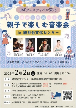 JAF(一般社団法人日本自動車連盟)東北本部(本部長 渡辺 広章)は、2025年2月2日(日)に観月台文化センター(福島県伊達郡国見町)で『JAFフェスティバル東北「0歳から参加できる 親子で楽しむ音楽会」in 観月台文化センター』を開催します。