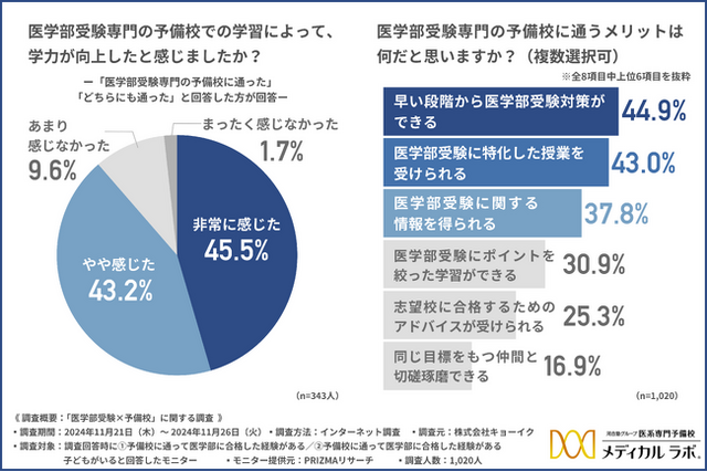 そこで今回、医系専門予備校メディカルラボ(河合塾グループ)(https://www.medical-labo.com/)を運営する株式会社キョーイク(https://www.kyo-iku.co.jp/)は、1.予備校に通って医学部に合格した経験がある方/2.予備校に通って医学部に合格した経験がある子どもがいる方を対象に、「医学部受験×予備校」に関する調査を行いました。