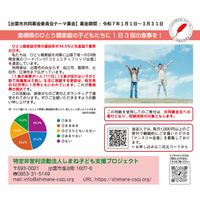 「島根県のひとり親家庭の子どもたちに1日3回の食事を!」をテーマに、3ヶ月間、改めて募金活動に力を注ぎます。目標額は100万円です。「赤い羽根」の「しまねテーマ募金」という仕組みを活用させて頂きます。