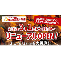 【3月1日(土)17:00リニューアルオープン!】北海道ご当地焼鳥を楽しめる『いただきコッコちゃん北8条店』がリニューアル記念の人気商品ほぼ半額祭りを3日間限定で開催!お子さまドリンク0円も!