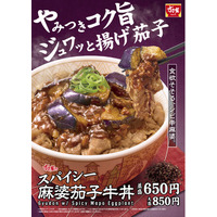 【すき家】ジュワッと揚げ茄子とシビれる辛さが食欲をそそる!すき家「スパイシー麻婆茄子牛丼」発売!