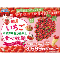 【いちご好き集まれー!! 国産いちご食べ放題!!】『クレープ』『寿司』『小籠包』など85品以上がたっぷり120分食べ放題!!数量限定のため事前予約がおすすめ!ニラックスブッフェ28店舗にて開催!!