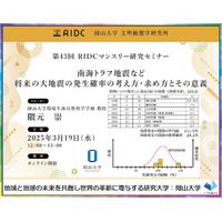 【岡山大学】高等先鋭研究院 文明動態学研究所 第43回RIDCマンスリー研究セミナー「南海トラフ地震など将来の大地震の発生確率の考え方・求め方とその意義」〔3/19,水 オンライン開催〕