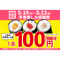 期間限定!お買い得!5月19日(月)~「手巻寿し大感謝祭」開催!手巻寿し人気の3種類を【特別価格】100円!(税込108円)で販売します!