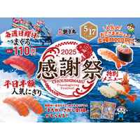 【すし銚子丸】銚子丸感謝祭! 5/17より、「人気ネタ 平日半額」、「おこさまメニュー110円」全店同時開催「生本まぐろ解体」など。一カ月間全力感謝!