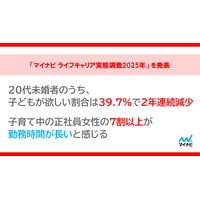 20代未婚者のうち子どもが欲しい割合は39.7%で2年連続減少。子育て中の正社員女性の7割以上は勤務時間が…