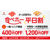 “秋の大盤振る舞い”!かっぱ寿司の食べ放題「かっぱの食べホー」に9月18日(木)から期間限定400円OFF※の「平日割」が新登場!さらに、学生証を見せると「平日学割」も適用で、最大1,200円OFF!