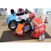 小学生が対象、ロードサービス隊員になりきり本物のタイヤと工具を使ったタイヤ交換を体験できます。 …