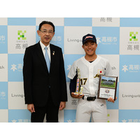 高槻市立第一中学校3年の水越統也さんが野球の世界大会優勝を市長に報告