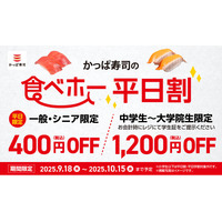 “食欲の秋もかっぱ寿司で楽しもう”「かっぱの食べホー」400円OFF「平日割」、800円OFF「平日学割」を本日より10/15(水)まで延長!「平日割」+「平日学割」で最大1,200円OFF!