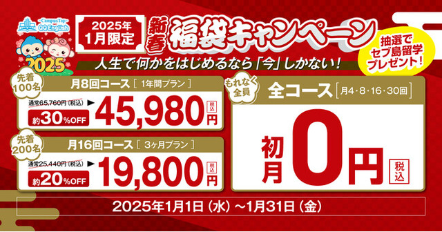 株式会社QQEnglish(本社:東京都渋谷区、代表取締役:藤岡 頼光)は、オンライン英会話サービス「QQEnglish」「QQキッズ」にて、2025年1月1日(水)より「2025年新春福袋キャンペーン」を開始いたしましたことをお知らせいたします。
